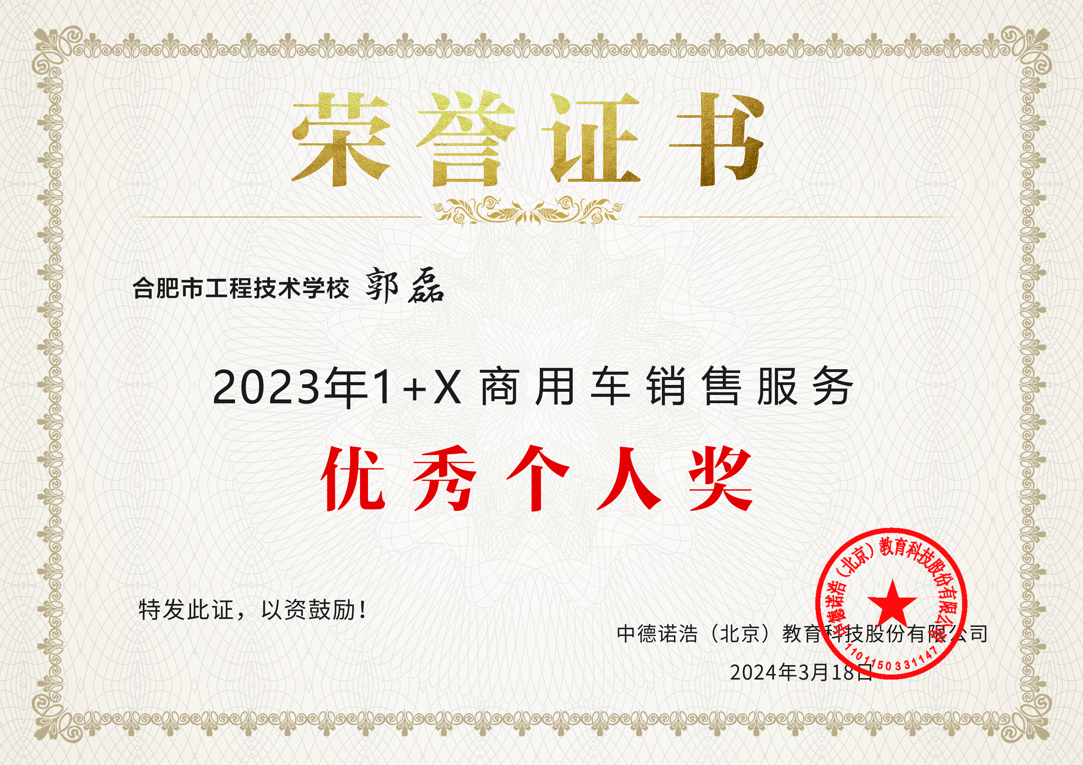學(xué)校被授予“1+X”數(shù)字創(chuàng)意建模職業(yè)技能等級(jí)證書“模范帶頭院?!保?+X”呼叫中心客戶服務(wù)與管理職業(yè)技能等級(jí)證書“金牌考核站點(diǎn)”,榮獲“1+X”商用車銷售服務(wù)“優(yōu)秀成果獎(jiǎng)”。張華平、韓黎冉、郭磊三位老師分別被授予“優(yōu)秀指導(dǎo)教師獎(jiǎng)”“優(yōu)秀考評(píng)員獎(jiǎng)”和“優(yōu)秀個(gè)人獎(jiǎng)”。