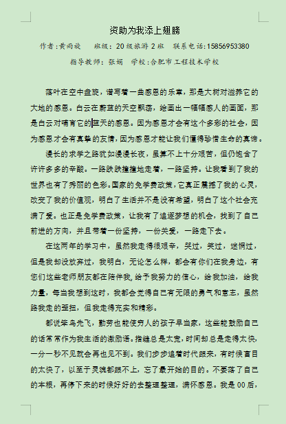 3、線上“助學(xué)筑夢鑄人”資助征文活動(dòng),20級和21級報(bào)來的征文中有47篇征文,經(jīng)認(rèn)真評選:21級計(jì)算機(jī)1班童雯妍同學(xué)“助學(xué)筑夢鑄人”和20級旅游2班黃雨旋同學(xué)“資助為我添上翅膀”兩篇推薦上報(bào)。