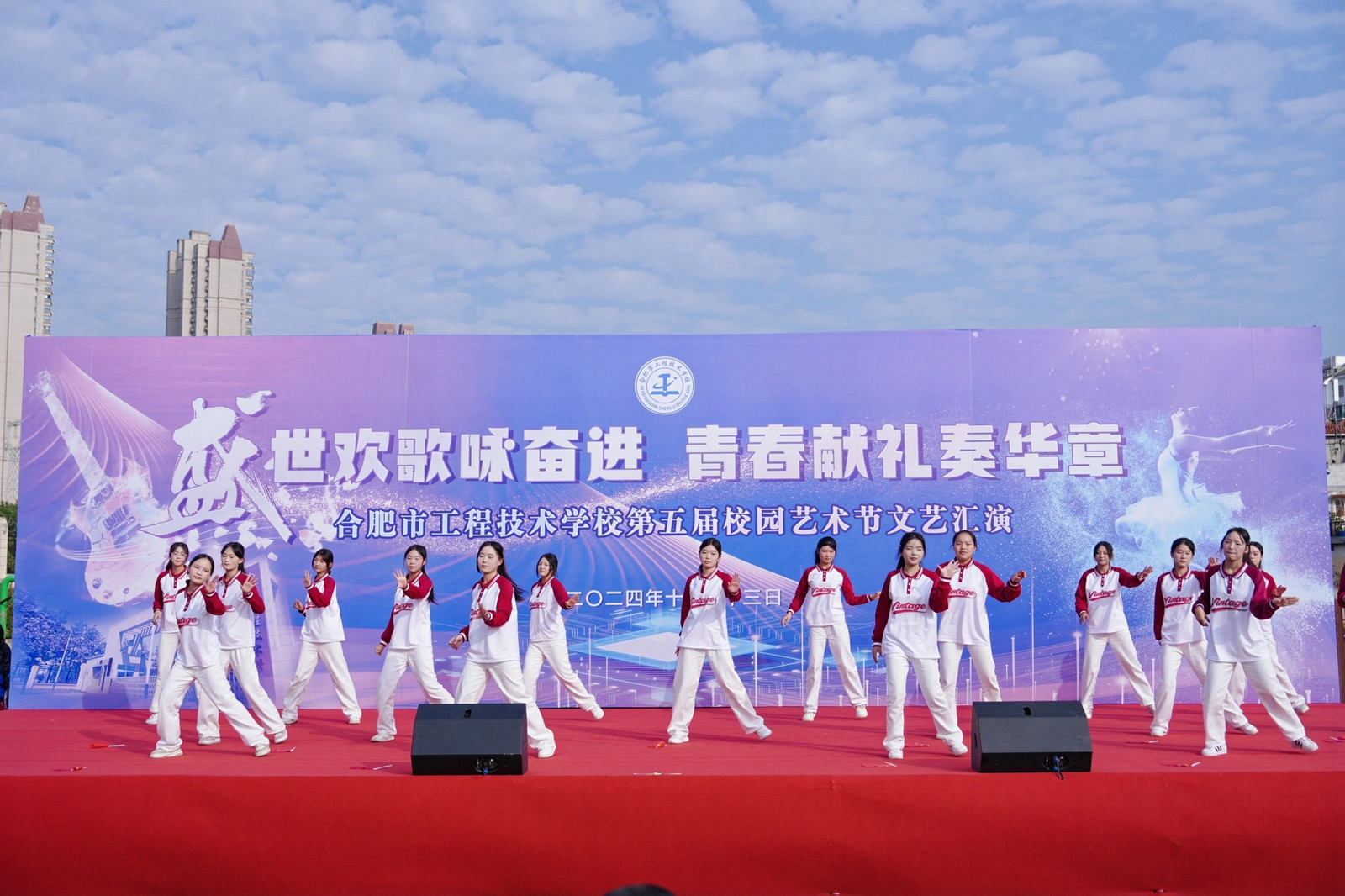 為全面落實立德樹人根本任務(wù),充分發(fā)揮文藝活動在提高學(xué)生人文素養(yǎng)方面的獨特作用,以美育人,以文化人,展現(xiàn)我校學(xué)子的家國情懷和青春風(fēng)采,營造文明高雅、奮發(fā)向上的校園文化氛圍。11月13日下午,合肥市工程技術(shù)學(xué)校隆重舉辦第五屆校園藝術(shù)節(jié)文藝匯演,本屆校園藝術(shù)節(jié)主題為“盛世歡歌詠奮進,青春獻禮奏華章”。全校師生齊聚運動場共饗藝術(shù)盛會,蒞臨本次活動現(xiàn)場的領(lǐng)導(dǎo)有巢湖市第一中學(xué)校長劉德海,巢湖市第二中學(xué)校長何學(xué)寶,巢湖市第四中學(xué)黨委書記張志華,合肥市工程技術(shù)學(xué)校黨委書記王成滿,合肥市工程技術(shù)學(xué)校校長潘明,以及合肥市工程技術(shù)學(xué)校各處室負責(zé)人。