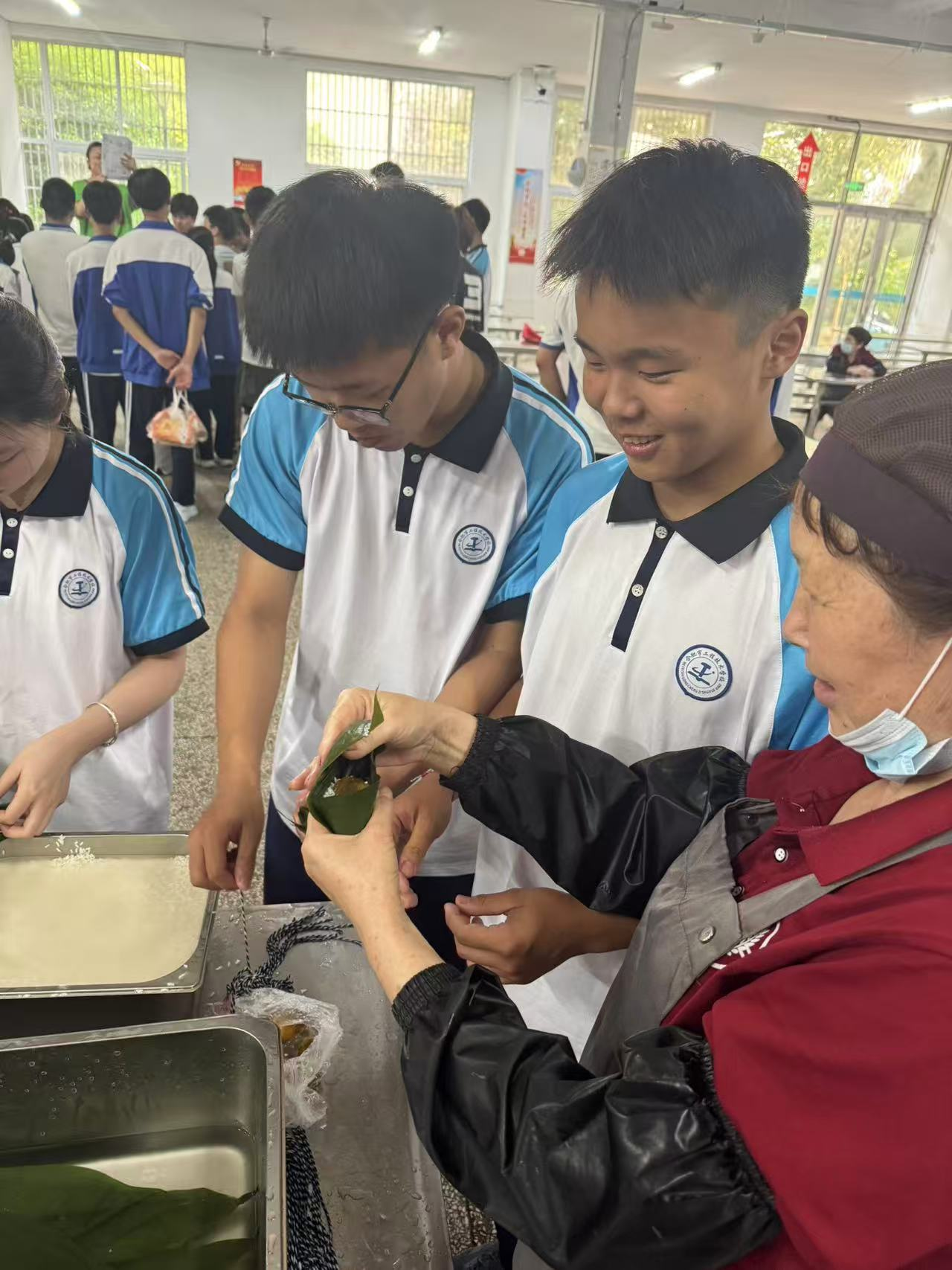 而在包粽子活動現(xiàn)場,更是充滿了歡聲笑語與溫馨氛圍。食堂師傅們早早準(zhǔn)備好糯米、蜜棗、粽葉、棉線等材料,整齊地擺放在桌上。參與活動的同學(xué)們迅速圍聚在一起,迫不及待地想要學(xué)習(xí)這一傳統(tǒng)技藝。經(jīng)驗豐富的食堂阿姨們耐心細(xì)致地講解包粽子的技巧和步驟,并親自示范操作:先將粽葉卷成漏斗狀,放入適量的糯米和蜜棗,再把粽葉巧妙地包裹嚴(yán)實,最后用棉線纏繞扎緊,一個棱角分明的粽子便成型了。同學(xué)們認(rèn)真學(xué)習(xí),躍躍欲試。起初,大家手法生疏,包出的粽子形狀各異,不是粽葉漏米,就是綁繩松散。但在師傅們的悉心指導(dǎo)下,同學(xué)們逐漸掌握了要領(lǐng),動作愈發(fā)嫻熟,一個個飽滿緊實的粽子擺滿了桌面。活動現(xiàn)場彌漫著粽葉的清香,也融入著同學(xué)們的溫情與幸福。