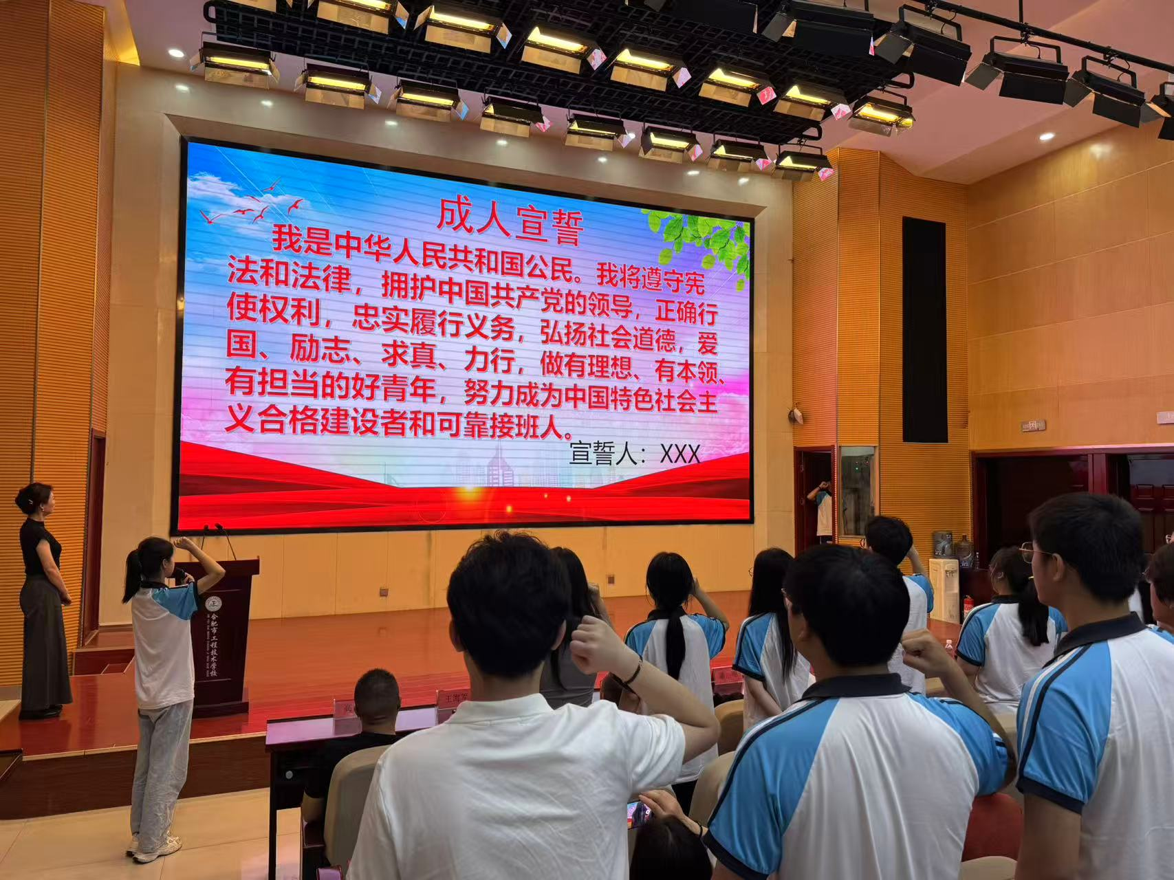 最后,在現(xiàn)場老師和家長的見證下,同學(xué)們緊握右拳,莊嚴宣誓。鏗鏘有力的誓言,表達了他們履行公民義務(wù)、承擔(dān)社會道義、為實現(xiàn)中華民族偉大復(fù)興貢獻青春力量的堅定信念。