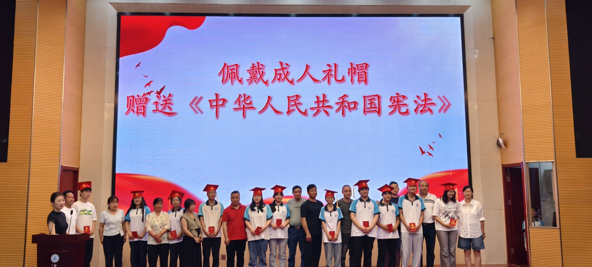 冠禮是中華民族傳承千年的成人儀典,這一承載文明基因的禮儀規(guī)制,不僅是個人成長的重要里程碑,更意味著社會責(zé)任的鄭重擔(dān)承。在全場師生的共同見證下,儀式迎來最莊嚴的時刻——家長們親手為孩子佩戴象征成年的禮帽,并鄭重頒贈《中華人民共和國憲法》,寓意以憲法精神護航成年之路,在法治信仰的引領(lǐng)下開啟責(zé)任與擔(dān)當(dāng)?shù)娜松缕?/span>