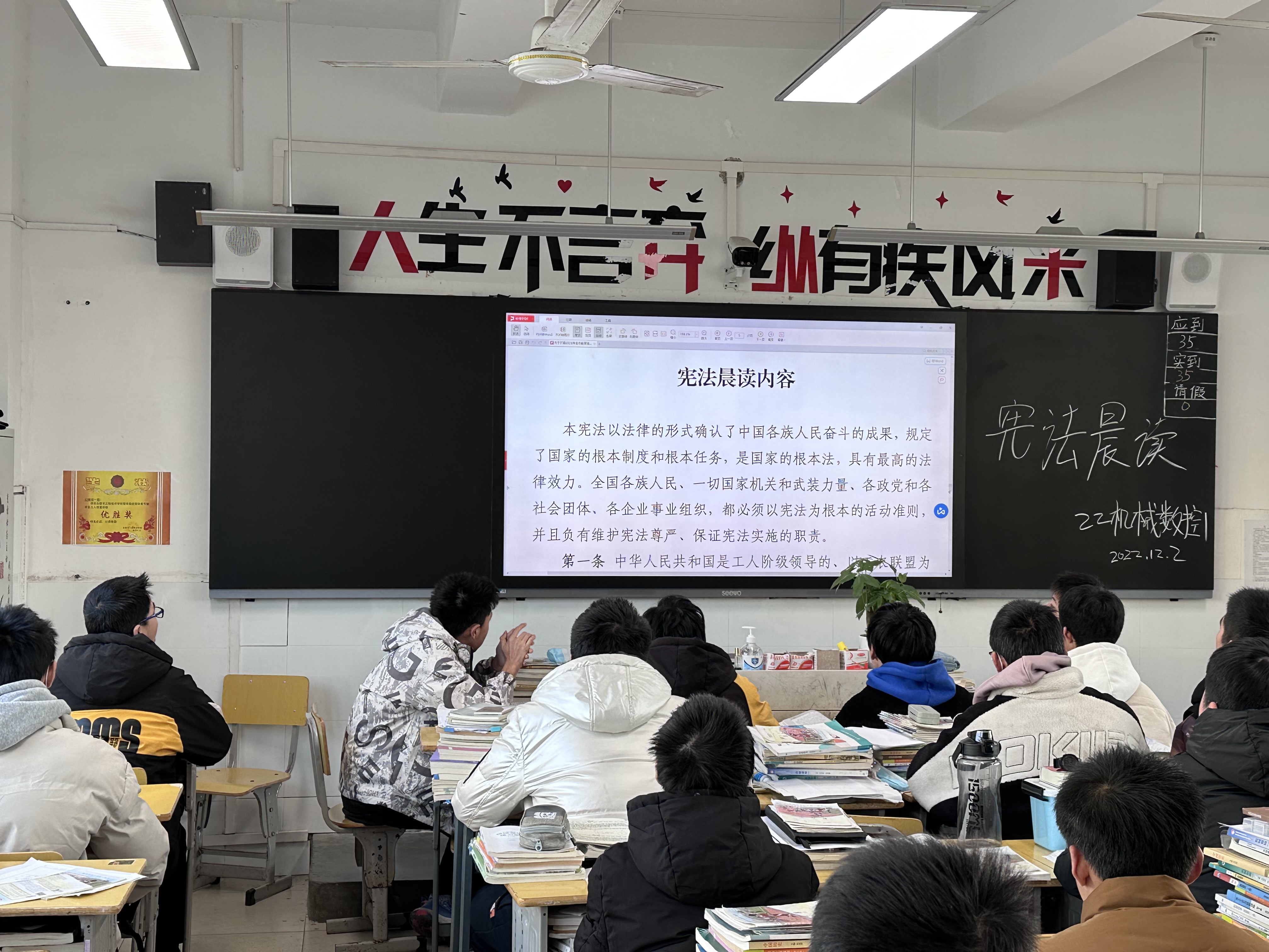 二、組織開展“憲法晨讀”。各班利用早讀課時間,在班主任的帶領(lǐng)下學(xué)習(xí)憲法內(nèi)容,引導(dǎo)學(xué)生在大聲朗讀憲法法律過程中,用心體會憲法的莊嚴與神圣,讓學(xué)生們從內(nèi)心尊崇憲法、捍衛(wèi)憲法,將憲法精神內(nèi)化于心外化于行。