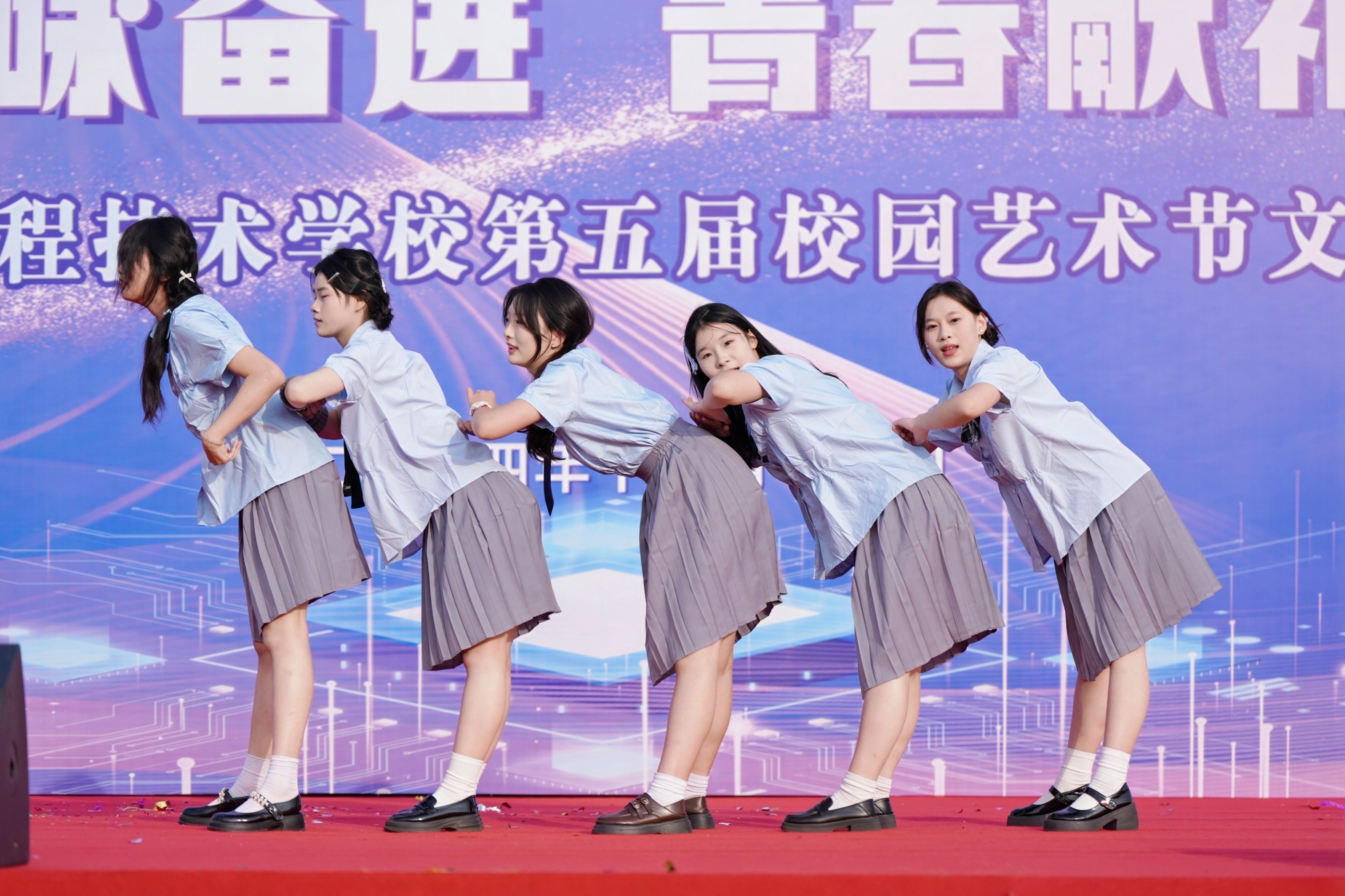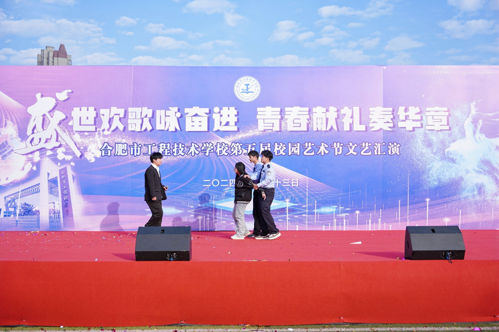 為全面落實立德樹人根本任務(wù),充分發(fā)揮文藝活動在提高學(xué)生人文素養(yǎng)方面的獨特作用,以美育人,以文化人,展現(xiàn)我校學(xué)子的家國情懷和青春風(fēng)采,營造文明高雅、奮發(fā)向上的校園文化氛圍。11月13日下午,合肥市工程技術(shù)學(xué)校隆重舉辦第五屆校園藝術(shù)節(jié)文藝匯演,本屆校園藝術(shù)節(jié)主題為“盛世歡歌詠奮進,青春獻禮奏華章”。全校師生齊聚運動場共饗藝術(shù)盛會,蒞臨本次活動現(xiàn)場的領(lǐng)導(dǎo)有巢湖市第一中學(xué)校長劉德海,巢湖市第二中學(xué)校長何學(xué)寶,巢湖市第四中學(xué)黨委書記張志華,合肥市工程技術(shù)學(xué)校黨委書記王成滿,合肥市工程技術(shù)學(xué)校校長潘明,以及合肥市工程技術(shù)學(xué)校各處室負責(zé)人。