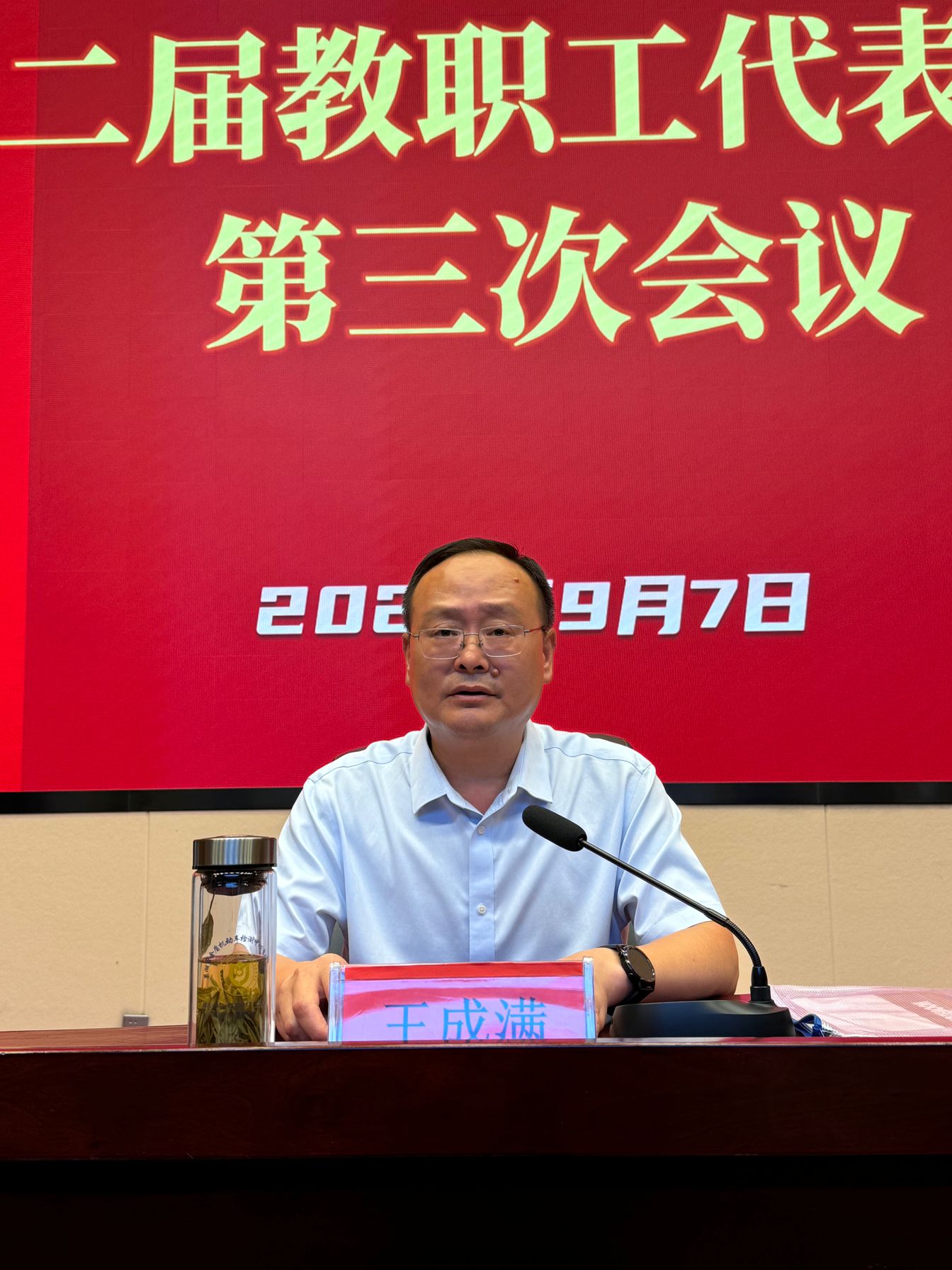 大會(huì)閉幕時(shí),校黨委書(shū)記王成滿作了講話,他指出,會(huì)議充分發(fā)揚(yáng)了民主精神,彰顯了代表們的責(zé)任感和使命感,展現(xiàn)了教職工團(tuán)結(jié)一心、共謀發(fā)展的良好風(fēng)貌。他提出,為貫徹落實(shí)本次會(huì)議精神,進(jìn)一步做好教代會(huì)工作,推動(dòng)學(xué)校事業(yè)高質(zhì)量發(fā)展,各位代表要解放思想,積極建言獻(xiàn)策,堅(jiān)守維護(hù)、保障廣大教職工根本利益的使命,充分利用教代會(huì)平臺(tái),深入思考,獻(xiàn)計(jì)獻(xiàn)策;要強(qiáng)化學(xué)習(xí),不斷提升自己,發(fā)揮榜樣作用,樹(shù)立高尚師德,形成良好教風(fēng),提升個(gè)人綜合素質(zhì),加強(qiáng)教育教學(xué)能力;要心系學(xué)校,強(qiáng)化責(zé)任意識(shí),以主人翁的姿態(tài)牢固樹(shù)立責(zé)任意識(shí),貫徹落實(shí)學(xué)校工作部署,樹(shù)立大局意識(shí)、團(tuán)隊(duì)意識(shí)和合作意識(shí),為學(xué)校高質(zhì)量發(fā)展而奮發(fā)努力。